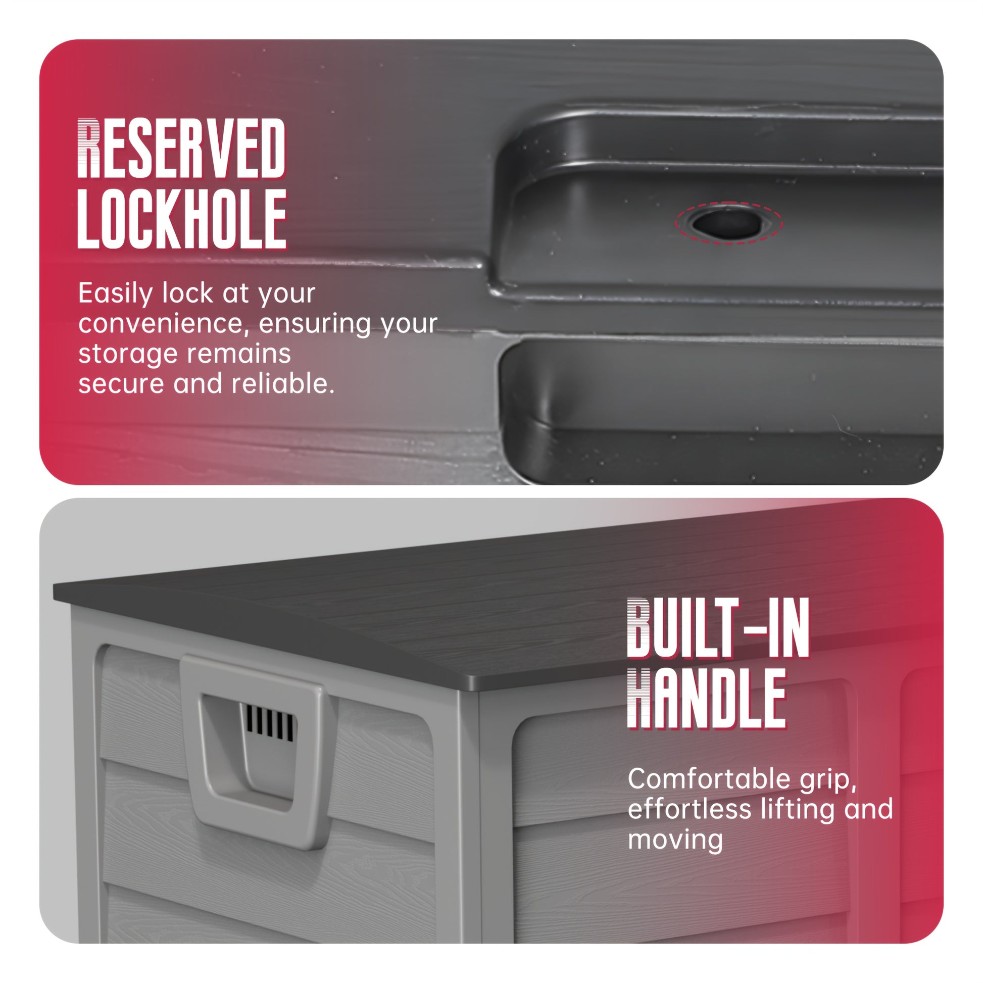 - Built-in handles on the sides make it simple to move the box around the deck or garage, even when it’s loaded.