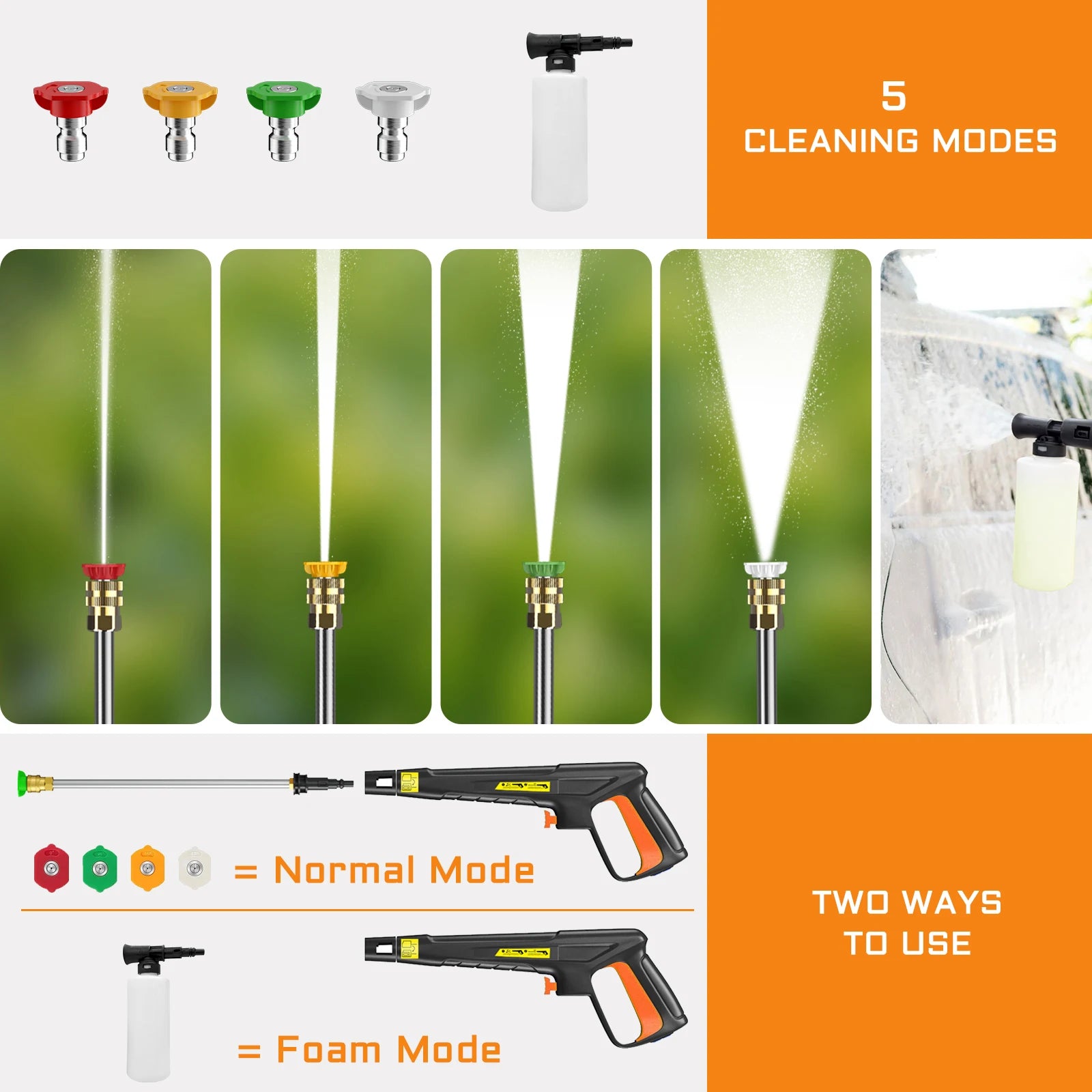 - Four interchangeable nozzles — 0° for high-velocity spot cleaning, 25° for medium-pressure surface cleaning, 40° for gentler cleaning, and a soap applicator tip for efficient detergent application.
